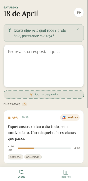 App de diário pessoal mobile-first onde a IA analisa humor, emoções e temas em background. Dashboard com streak de escrita, gráficos de humor semanais e insights gerados por IA.