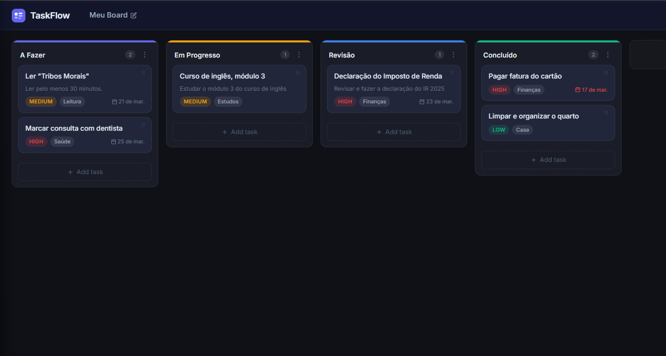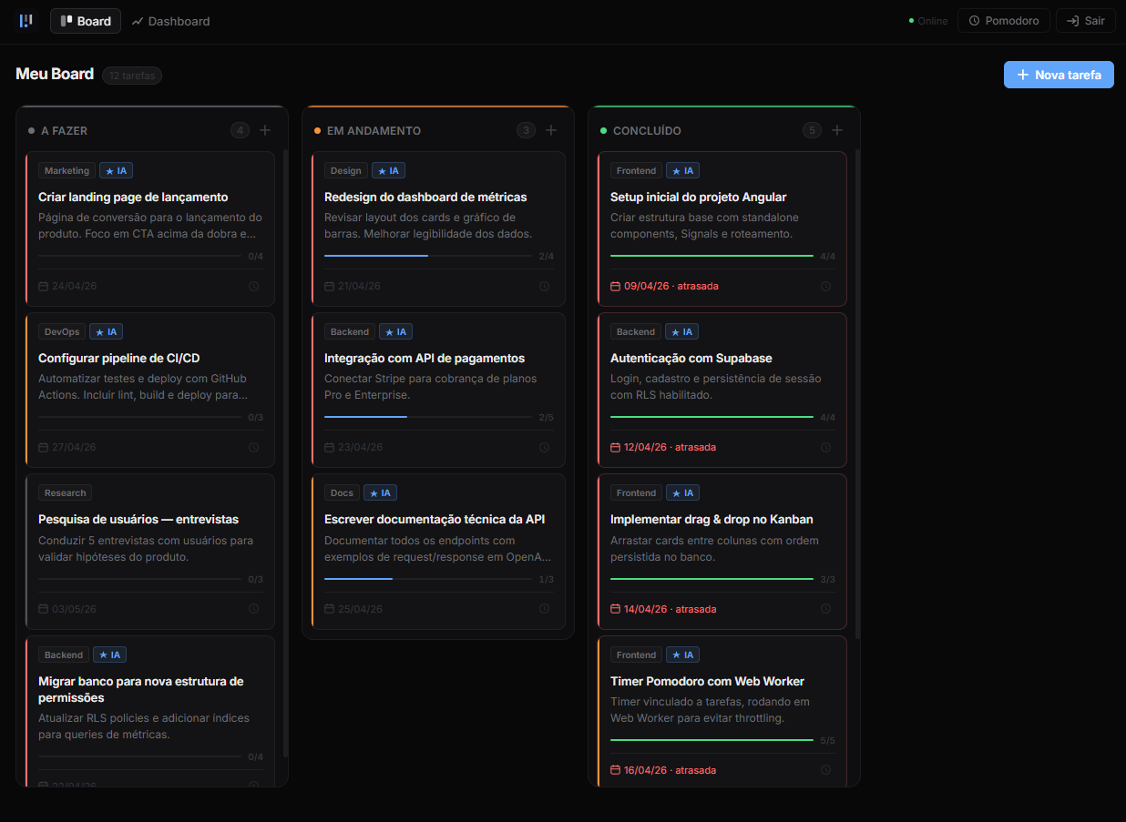 Kanban board com IA integrada (Groq + Llama 3.1) que sugere prioridade, categoria e subtarefas ao criar tarefas. Timer Pomodoro por tarefa rodando em Web Worker, dashboard de produtividade com streak, gráficos e insights gerados por IA.